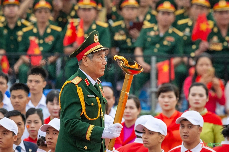 Герой народных вооружeнных сил, генерал-лейтенант Нгуен Дык Шоат, бывший Заместитель начальника Генерального штаба Вьетнамской народной армии (ВНА), зажег памятный факел революционной традиции на торжественной церемонии, параде и шествии. |