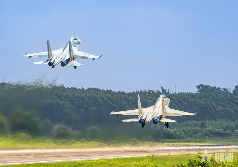 Истребители Су-30МК2 поднимаются в воздух для выполнения задачи. |