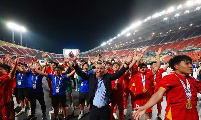 | Председатель ФФВ Чан Куок Туан поздравляет игроков сборной U22 Вьетнама до 22 лет с завоеванием золотой медали на 33-х Играх Юго-Восточной Азии (SEA Games 33). Фото: tuoitre.vn |