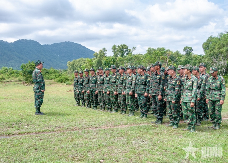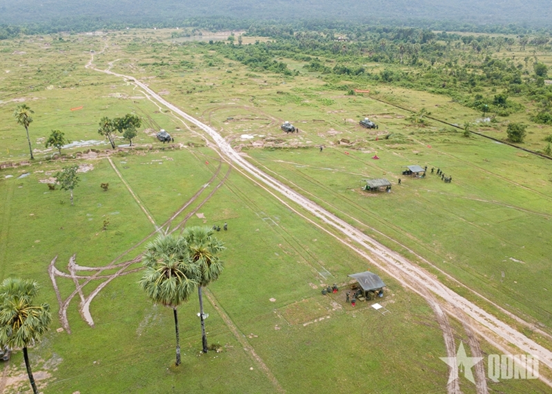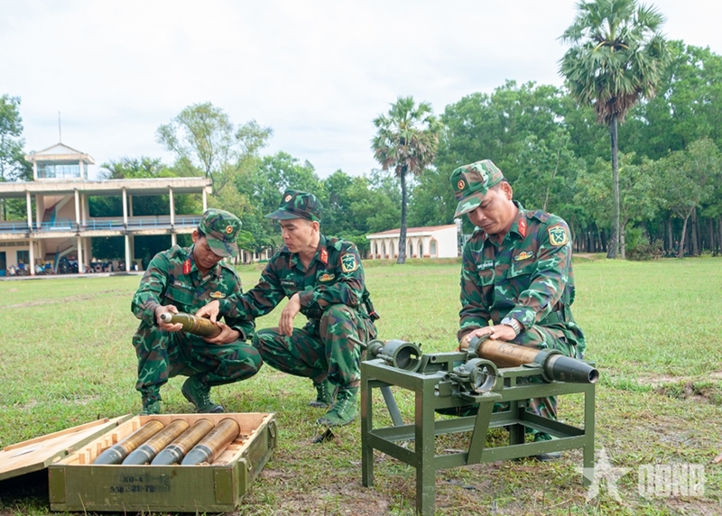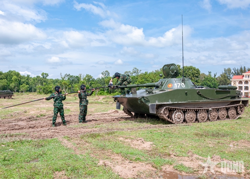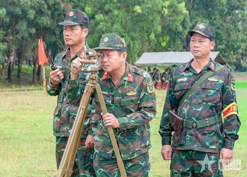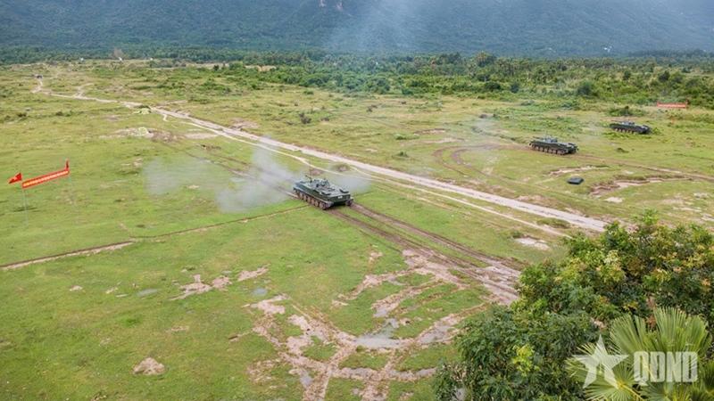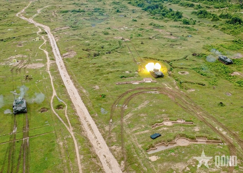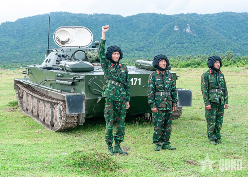 | Полковник Зыонг Динь Кан, Командир 416-й бронетанковой бригады (в центре), наблюдает за выполнением боевых стрельб экипажами. |