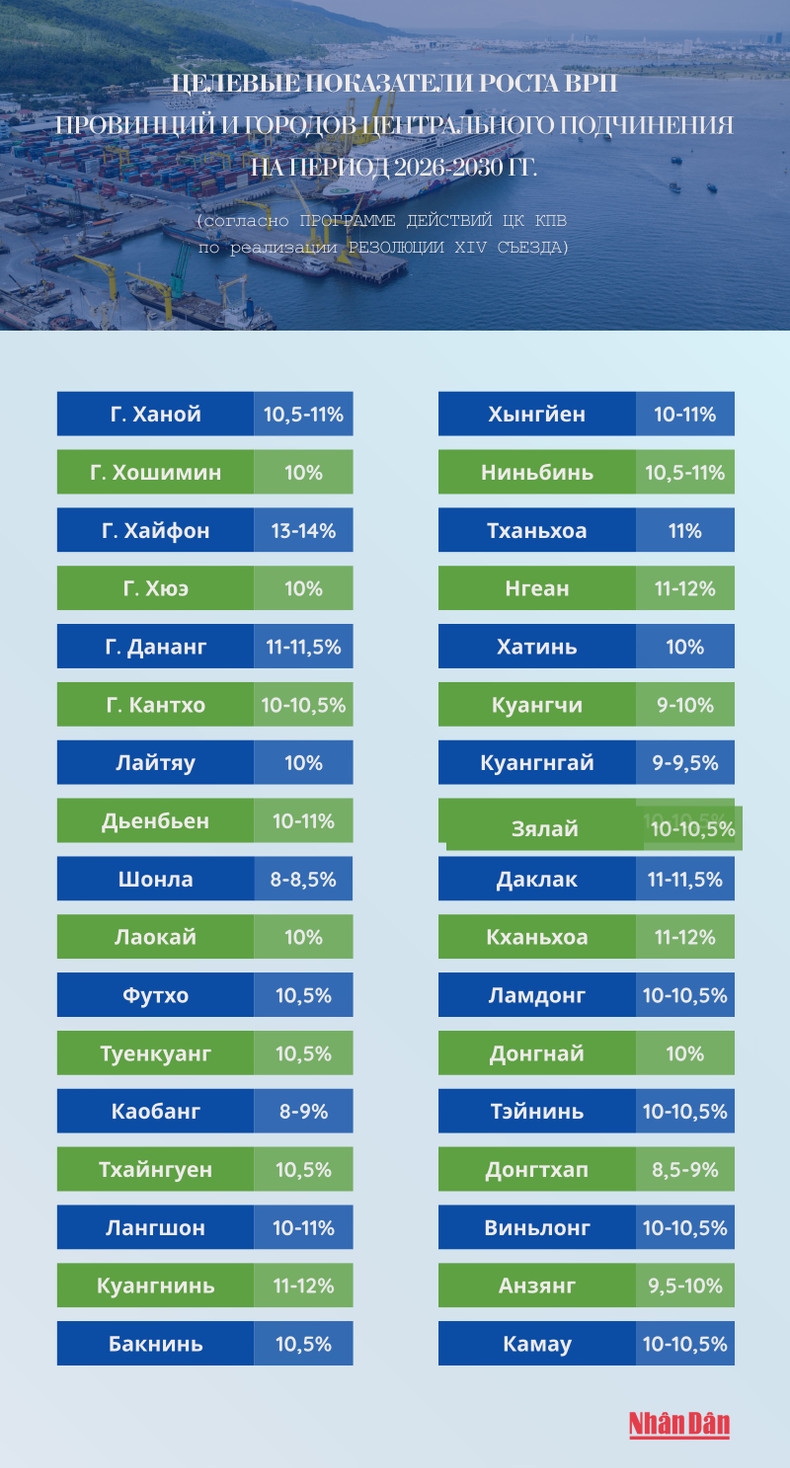 Целевые показатели роста ВРП провинций и городов центрального подчинения на период 2026-2030 гг. в соответствии с Программой действий ЦК КПВ по реализации Резолюции XIV съезда.