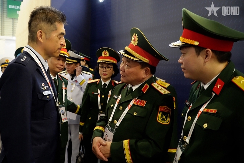 | Генерал армии Хоанг Суан Тьиен встречает и беседует с руководителями МО различных стран на выставке. |
