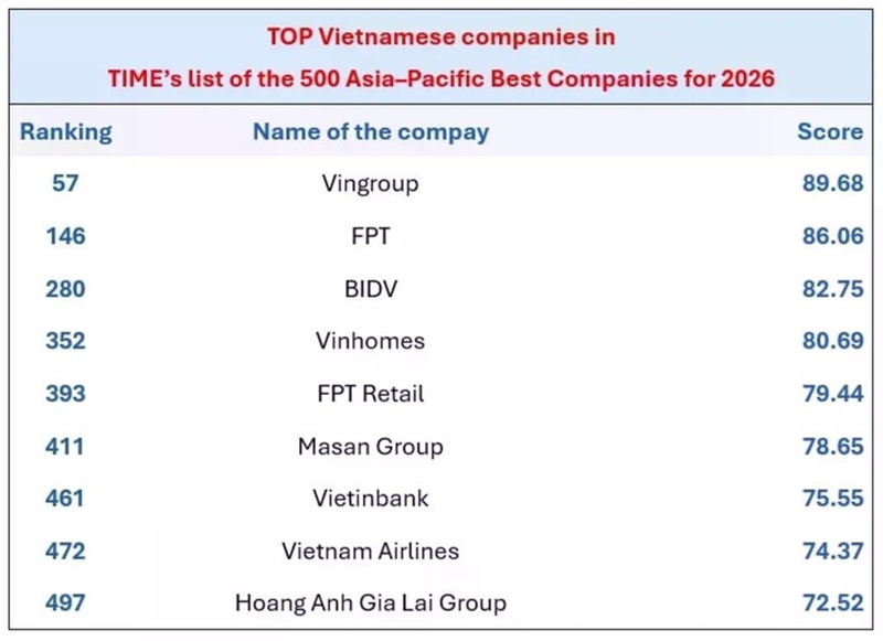 | Вьетнамские компании, вошедшие в список 500 лучших компаний Азиатско-Тихоокеанского региона за 2026 год по версии журнала TIME. |