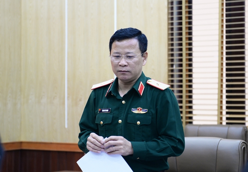 | Генерал-майор Тонг Ван Тхань, Заместитель начальника Управления политической пропаганды Главного политического управления ВНА, Заместитель руководителя инспекционной группы, выступает на совещании. |