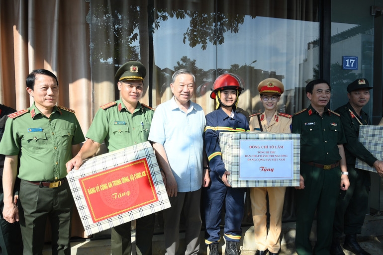 | Генеральный секретарь ЦК КПВ То Лам вручает подарки вооруженным силам, участвующим в ликвидации последствий тайфуна и наводнений в провинции Тхай Нгуен. Фото: Данг Кхоа |
