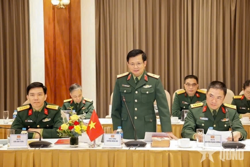 | Генерал-майор Зыонг Минь Хай выступает на переговорах с руководством Управления военных наук и истории МО Лаосской Народно-Демократической Республики. Фото: БУЙ ХА |