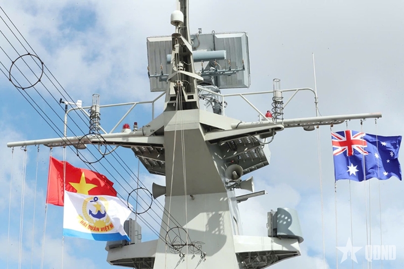 | На корабле 016 «Куанг Чунг» вместе с флагом Австралии развеваются государственный флаг Вьетнама и флаг ВМС Вьетнама. |