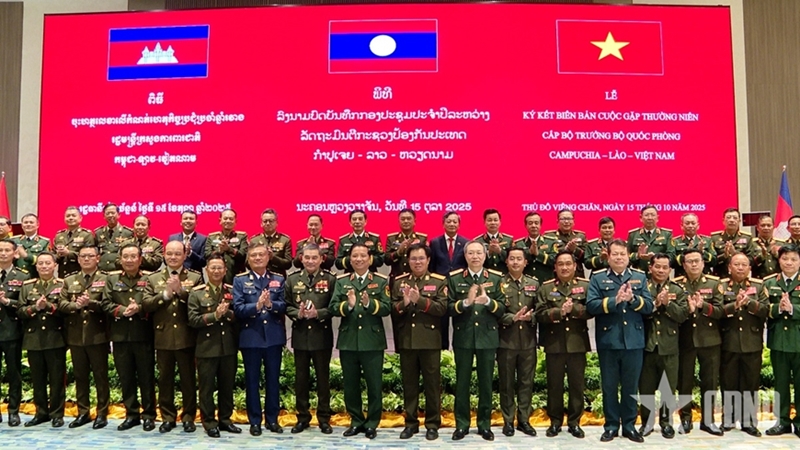 | Министры обороны Вьетнама, Лаоса и Камбоджи подписывают протокол встречи. |