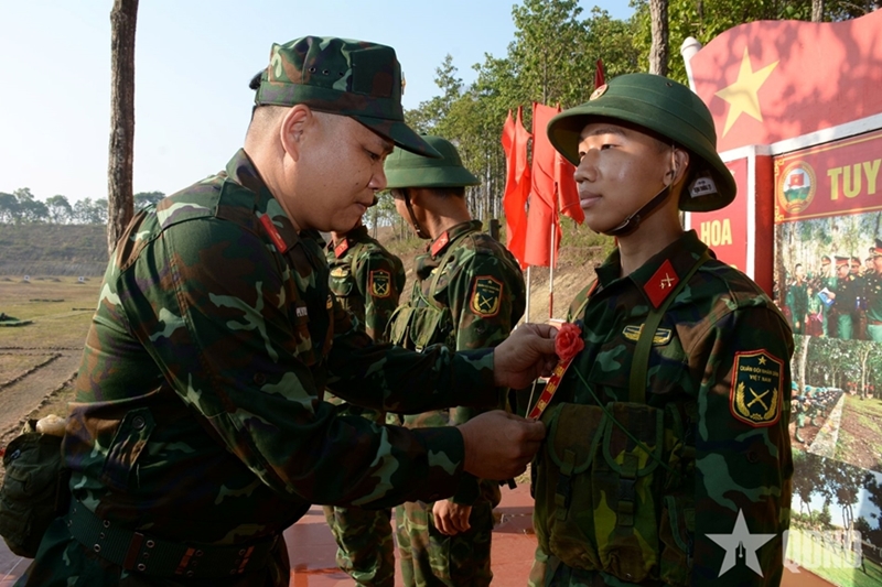 | Командиры 584-го полка награждают солдат за выдающиеся результаты на контрольных стрельбах боевыми патронами. |