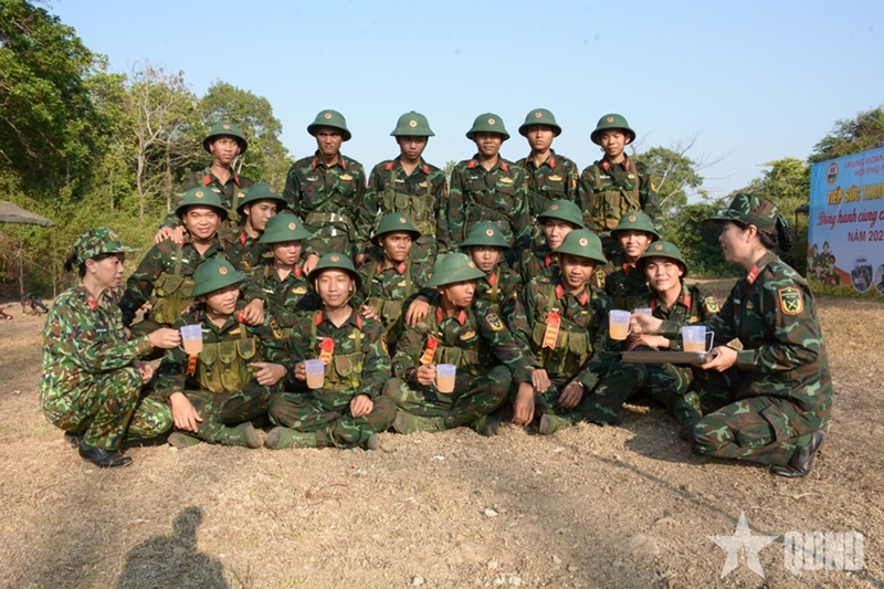 | Офицеры и представительницы Ассоциация женщин 584-го полка организуют обеспечение водой на полигоне и оказывают моральную поддержку солдатам, выполняющим контрольные стрельбы боевыми патронами. |