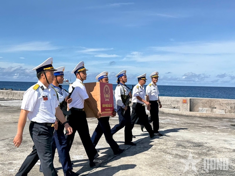 | Рабочая группа специального района Чыонгша и 4-го региона ВМС доставляет избирательную урну с корабля на остров. |