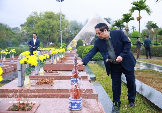 | Премьер-министр Фам Минь Тьинь воскуряет благовония в память о павших бойцах на кладбище павших бойцев A1. |