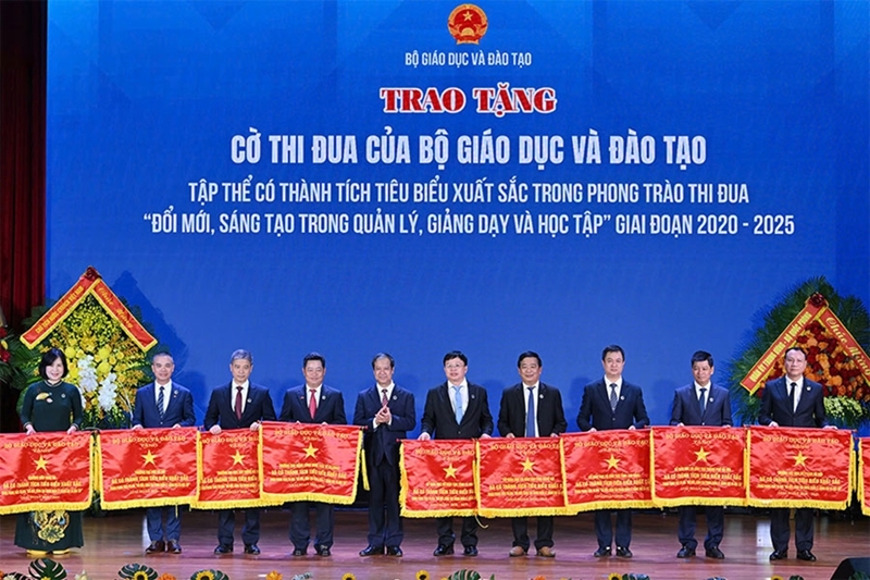 | Министр образования и подготовки кадров Нгуен Ким Шон вручает Знамена соревнования коллективам, добившимся выдающихся успехов в движениях соревнования за период 2020-2025 гг. |