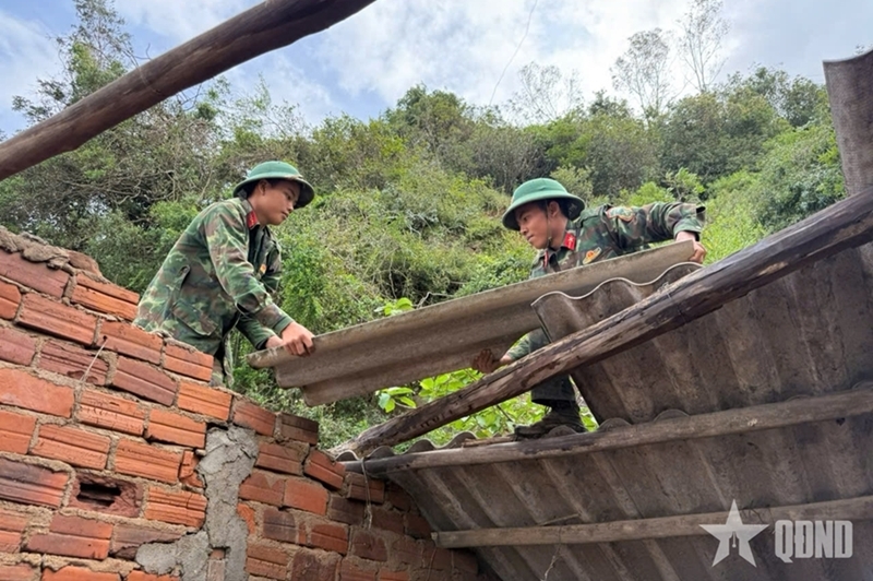 | Военнослужащие 95-го полка, 2-й дивизии, 5-го военного округа помогают жителям село Куангдык (община Тюиандонг провинции Даклак) устранять последствия наводнений. Фото: ШОН БИНЬ |