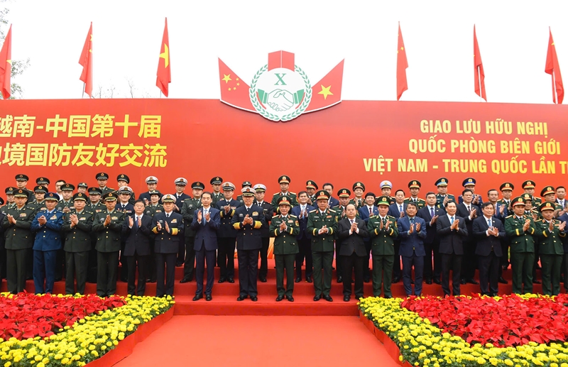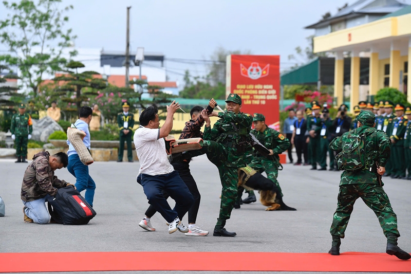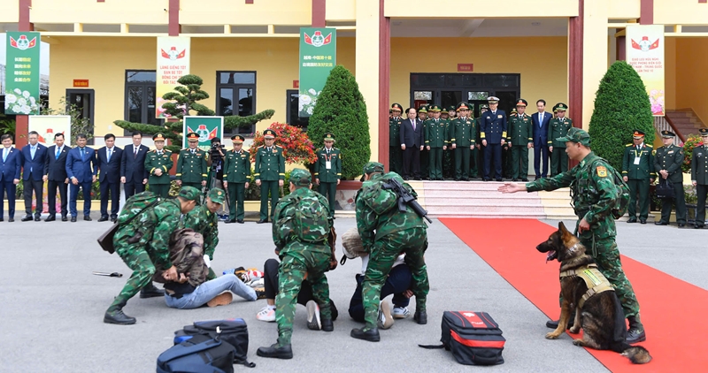 | Министры обороны Вьетнама и Китая наблюдают за действиями пограничников по отработке ситуации выявления и задержания наркопреступников. |
