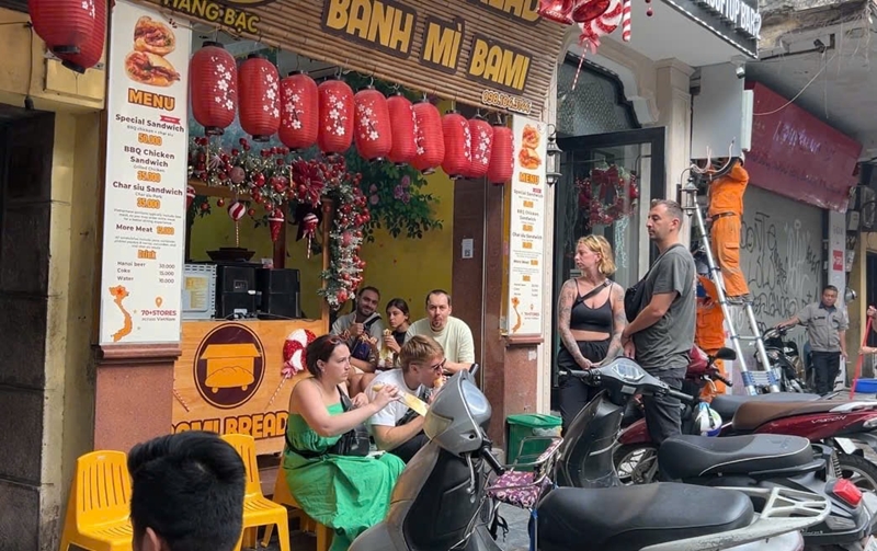 | Иностранные туристы пробуют ханойский баньми. Фото: ХОАНГ ТУНГ |