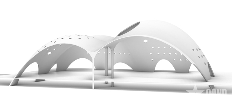 Купол театра навеян рябью Западного озера, имеет ультратонкую, сверхпрочную конструкцию и покрыт материалом с перламутровым эффектом, из за чего его облик меняется в течение дня, создавая ощущение движения. |