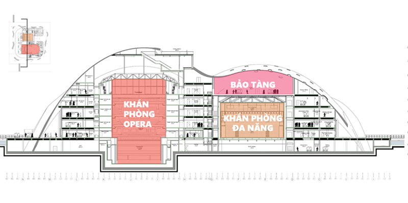 При общей площади около 40 980 м², что почти в шесть раз превышает площадь стандартного футбольного поля, Ханойский оперный театр будет иметь два больших зала: оперный зал на 1 797 мест и многофункциональный зал с мобильной системой кресел, позволяющей освобождать пространство под стоячие мероприятия (живые выступления, концерты) – до 1 430 зрителей стоя и 216 мест на балконе. Помимо двух залов, предусмотрены главное фойе, репетиционные и тренировочные помещения, музей и другие многофункциональные пространства. |