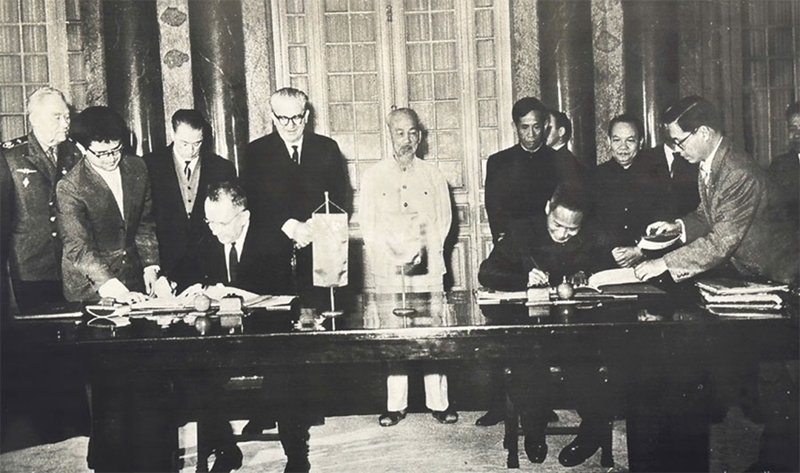 | Фотография, на которой Президент Хо Ши Мин наблюдает за церемонией подписания Совместного заявления между Вьетнамом и СССР в Ханое 10 февраля 1965 г., представлена на выставке. |