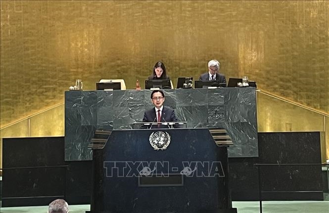 | Посол До Хунг Вьет выступает на пленарном заседании Генеральной Ассамблеи ООН. |