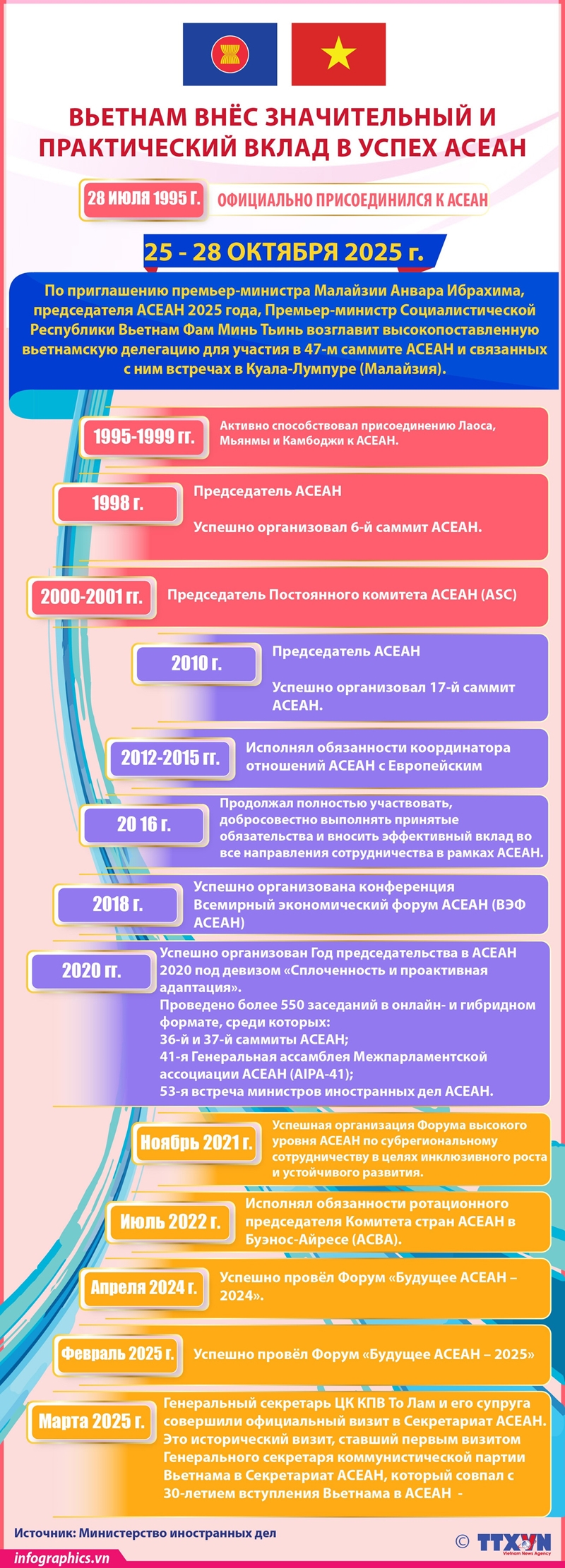 По приглашению Премьер-министра Малайзии Анвара Ибрагима, Председателя АСЕАН 2025 года, высокопоставленная делегация Вьетнама вл главе с Премьер-министром Вьетнама Фам Минь Тьинем принимают участие в 47-м саммите АСЕАН и сопутствующих саммитах, которые проходят в Куала-Лумпуре (Малайзия) с 25 по 28 октября 2025 года. Участие премьер-министра Фам Минь Тьиня в 47-м саммите АСЕАН и связанных саммитах продолжает демонстрировать убедительное послание о проактивном и активном Вьетнаме, ответственно внося свой вклад вместе со странами-членами в поддержание и укрепление центральной роли, продвигая ответственный голос АСЕАН за мир, стабильность и развитие.