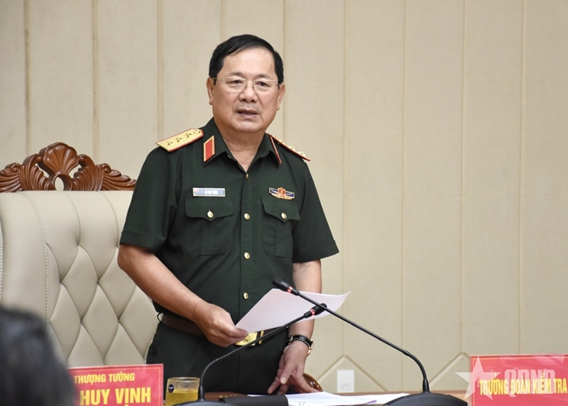 Генерал-полковник Ле Хюи Винь выступает с руководящей речью на проверке. |