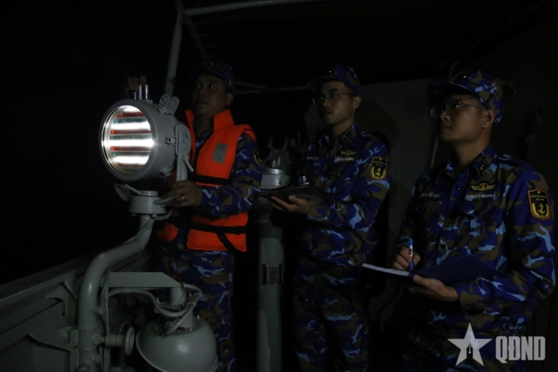 | Офицеры и матросы группы в составе кораблей 015 «Чан Хынг Дао» и 012 «Ли Тхай То» участвуют в отработке элементов светосигнальной связи. |