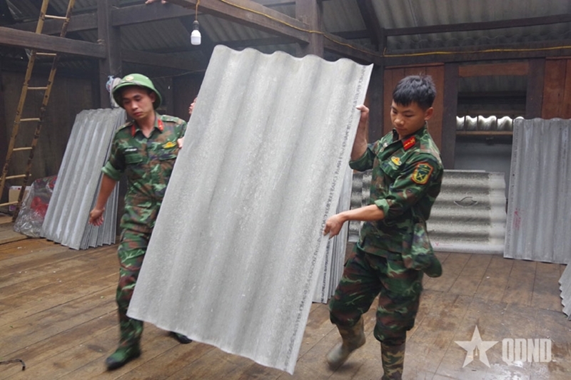 | Офицеры и солдаты Военного командования провинции Лаокай помогают жителям общины Тхыонгбангла в ремонте домов. |
